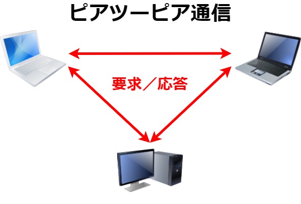 1台のコンピューターが、役割の分担なくクライアントとサーバー両方の役割を持ち、それぞれが構成上、上下関係なく同等の立場で相互にデータの通信を行う方式です。