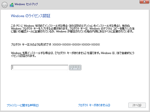 ラインセンス認証のキーを入力し、「次へ」を押して続行します。