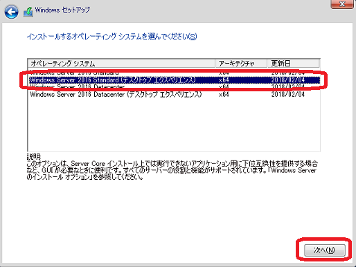 Windows Server Standard(デスクトップエクスペリエンス)を選択し、「次へ」を押して続行します。