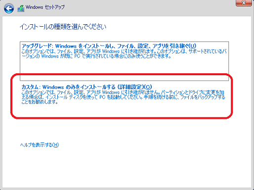 新規でインストールする場合は、「カスタム」を押して続行します。