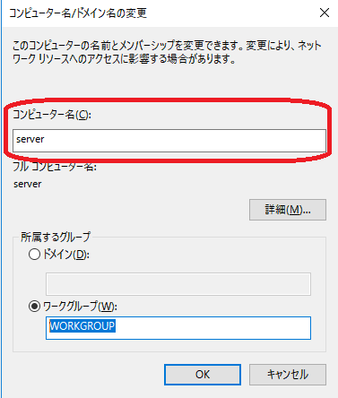 コンピュータ名を希望の名前に変更し、「OK」ボタンを押下します。