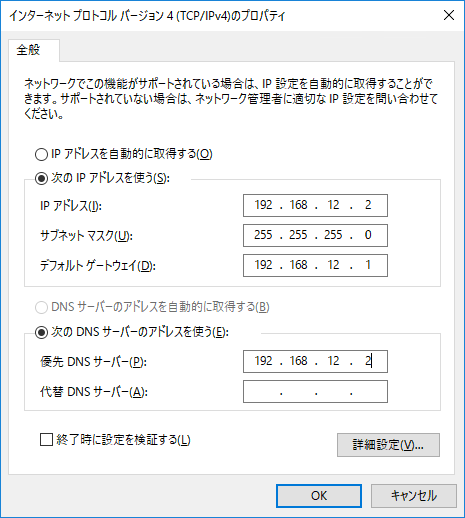 インターネットプロトコルバージョン4(TCP/IPv4)をクリックし、「プロパティ」をクリックし、 構築するネットワークの構成に基づき、 「IPアドレス」「サブネットマスク」「デフォルトゲートウェイ」「優先DNSサーバ」を入力します。 入力できたら「OK」をクリックします。
