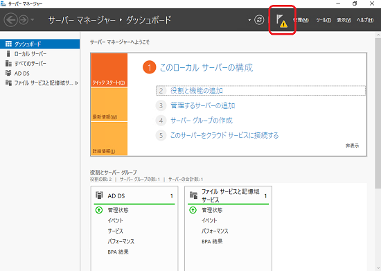 サーバーマネージャーへ戻ると、ウインドウ上部の旗マークに!マークがつきました。