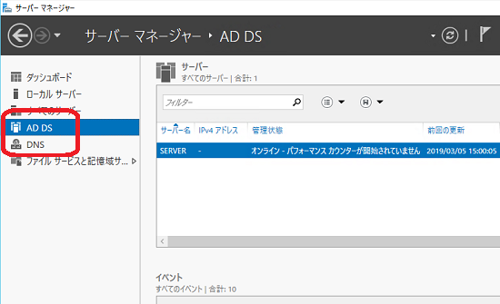ログインしてしばらくすると、「サーバーマネージャー」ウインドウが表示され、またしばらくすると、「AD DS」「DNS」が追加されます。
