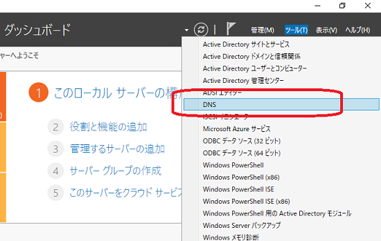 サーバーマネージャーのメニュー「ツール」をクリックし、「DNS」をクリックします。