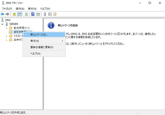 「SERVER」-「逆引き参照ゾーン」を右クリックし、「新しいゾーン」をクリックします。
