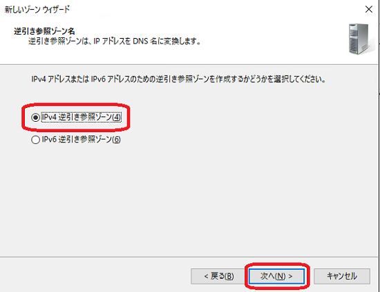 「IPv4逆引き参照ゾーン」を選択し、「次へ」をクリックします。