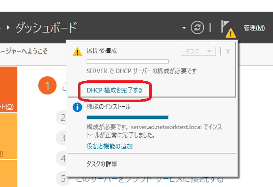 構成が必要なので、サーバーマネージャーの「!」マークをクリックし「DHCP構成を完了する」をクリックします。