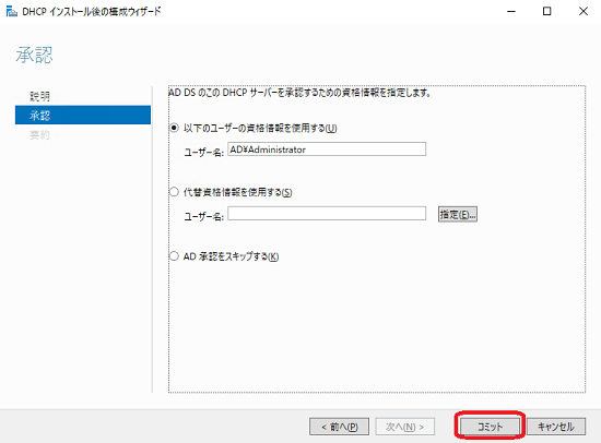 AD DS から承認を得るための資格情報を入力します。