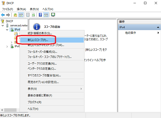 左ペインで [IPv4] を右クリックし、[新しいスコープ] を選択します。