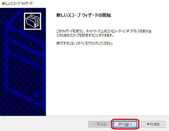 「スコープ名」を入力します。ここでは、「DHCPサーバスコープ」とします。 わかりやすい名前で保存してください。入力後「次へ」をクリックします。