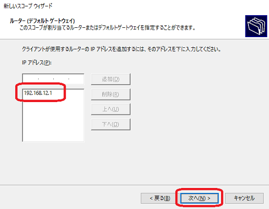 「IPアドレス」欄にルータのIPアドレスを入力し、「追加」クリックします。 追加された事を確認後「次へ」をクリックします。(構築するネットワークの構成参照)
