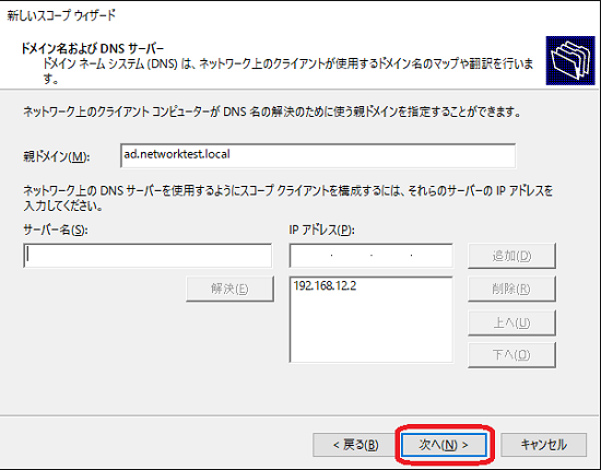 「サーバー名」に”SERVER”(サーバーに設定した名前)を入力し、「解決」ボタンをクリックします。 「IPアドレス」欄にIPアドレスが表示されます。「追加」ボタンをクリックします。 追加後「次へ」をクリックします。(図は、追加後の画面になります。)