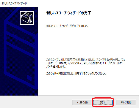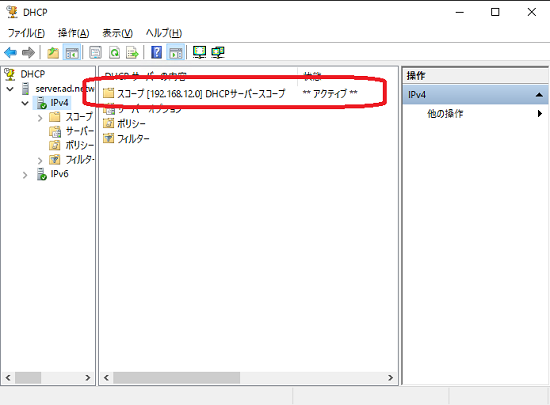 一覧にスコープが表示されます。以上で DHCP サーバーの構成は完了です。