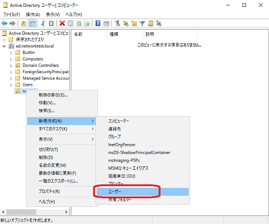ユーザーを作成したいOUを右クリックし、→「新規作成」→「ユーザー」をクリックします。