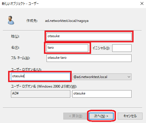 「ユーザーログオン名」は半角英数を使用します。また、同じ「ユーザーログオン名」を複数作成することはできません。 「次へ」をクリックします。