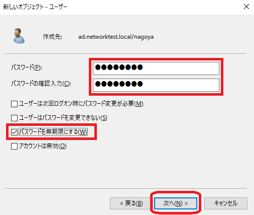 初期設定では、「ユーザーは次回ログオン時にパスワード変更が必要」のチェックが入っています。 チェックをはずし、「パスワードを無期限にする」にチェックを入れておきます。「次へ」をクリックします。