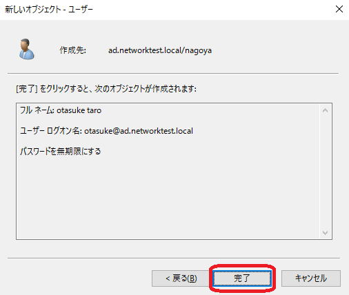 「完了」をクリックします。以上でユーザーが作成されます。