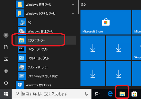 「スタート」-「Windows システム ツール」-「エクスプローラー」もしくは、タスクバーのアイコンをクリックし、 「エクスプローラー」を起動します。
