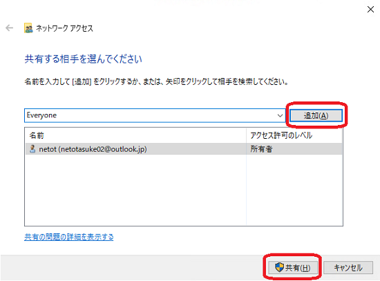 共有相手を追加し、「共有(H)」をクリックします。