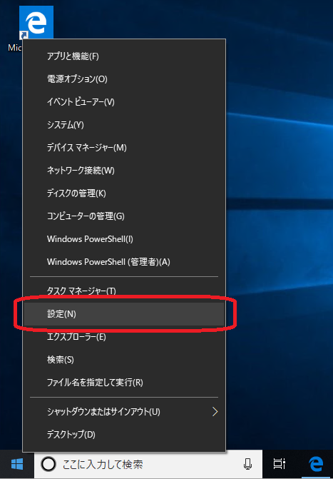 「スタート」ボタンを右クリックしてメニューを表示し、「設定」を選択します。