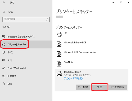 「プリンターとスキャナー」を選び、指定のプリンタの「管理」ボタンをクリックします。
