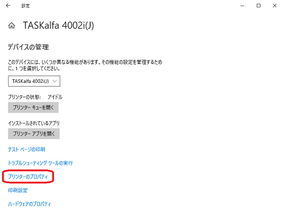 「デバイスの管理」にて「プリンターのプロパティ」をクリックします。
