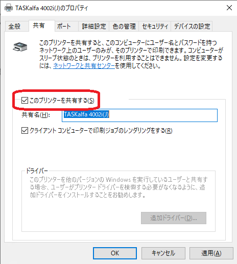 「共有」タグをクリックし、「このプリンターを共有する」をチェックします。
