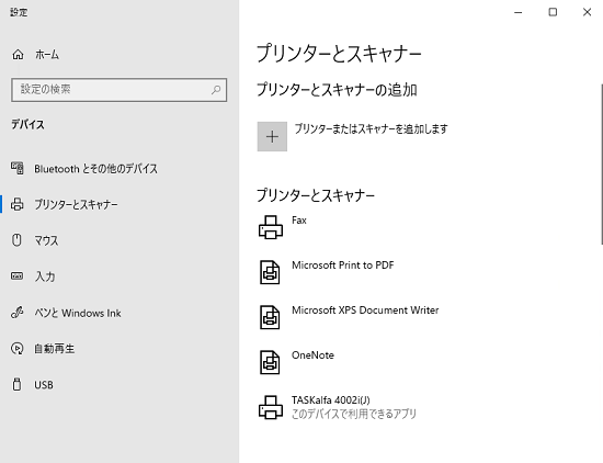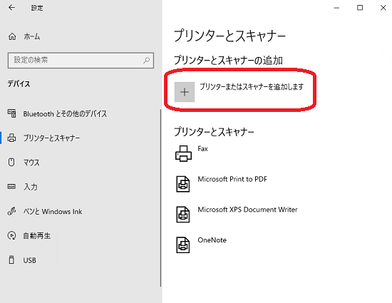 「設定」-「デバイス」-「プリンターとスキャナー」を選択し、「プリンターまたはスキャナーを追加します」をクリックします。