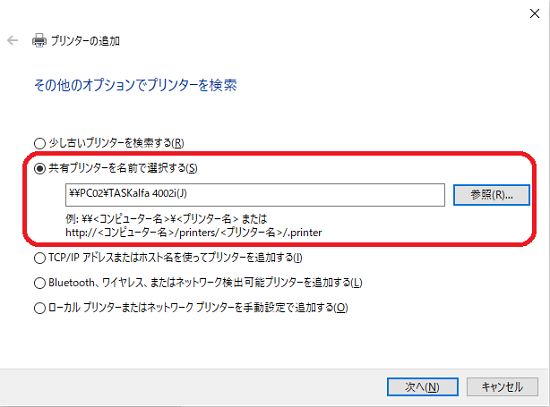 「共有プリンターを名前で選択する」を選択し、プリンター名を設定します。