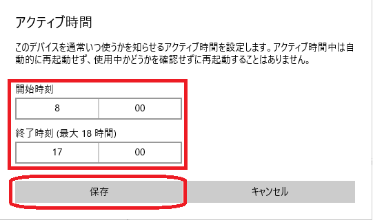 アクティブな時間(再起動しては困る時間帯)を設定し、保存します。