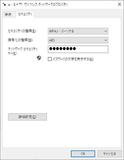 セキュリティの種類(WPA2)とネットワークキー(WPA2パスワード)を、アクセスポイント側で設定したものと同じように入力します。