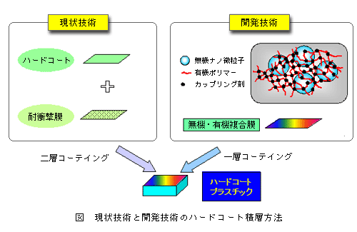 当研究所では、分子レベルで材料を複合化させるナノテクノロジーを駆使し、無機材料と有機材料との複合化技術の開発に取り組んできました。その結果、図の右に示す1層で密着性、耐擦傷性、耐衝撃性すべてにおいて良好な性能を示す、プラスチック眼鏡レンズ用無機・有機ナノ複合体耐衝撃性ハードコートを開発しました。