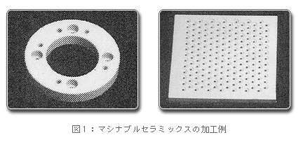 一般にセラミックスは原料粉体をさまざまな方法で成形した後、仮焼きを行い、必要に応じて機械加工した後に本焼成します。焼成したままの焼成体では寸法精度が±0.1mm程度ですから、高精度を要求される場合には焼成後に加工が必要となります。ダイヤモンド砥石などで切削、研削、研磨などの加工をしますが、この加工は金属を加工する場合よりも一般に時間も費用も多く掛かります。たとえば、磁器の茶碗に自由に孔を開けることは簡単なことではありません。金属のように一般的な加工機械で切ったり削ったり穴を開けたりすることができれば、セラミックスの利用はもっと増えるでしょう。そこで機械加工が容易なセラミックス、即ちマシナブルセラミックスが開発されています。図1に示すような複雑な形状に後加工ができることはマシナブルセラミックスの大きな特長です。