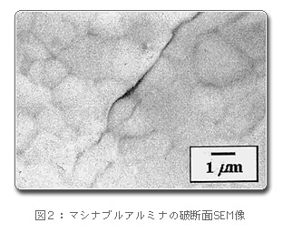当研究所では従来のマシナブルセラミックスの設計方針とは異なる方向で構造用酸化物セラミックスのマシナブル化に取り組んでいます。アルミナセラミックスなどなじみの深い構造用酸化物セラミックスに、マシナブル化剤となるセラミックスを添加して固相反応で焼結させます。この方法でできた複合セラミックス(たとえばアルミナ−マシナブル化剤系複合セラミックス:マシナブルアルミナ)は構造用酸化物セラミックス粒子(アルミナ)とマシナブル化剤セラミックス粒子の界面で亀裂が進行する組織を持つマシナブルセラミックスになります(図2)。