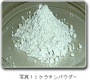 羊毛のケラチン蛋白質を抽出する方法には、酸化法と還元法との二つの方法があります。当センターでは高分子量の蛋白質が得られる還元抽出法を用いて、羊毛からケラチン蛋白質を抽出・精製し、この溶液を微粉末化して水に可溶性の活性ケラチンパウダー(粉末)を開発し(写真1)、これを原材料として各種製品を試作しました。