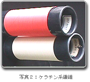 ケラチンパウダーとポリビニルアルコール(PVA)樹脂の混合水溶液を原料として、湿式紡糸法によりケラチン系フィラメント繊維を開発しました(写真2)。この繊維は、羊毛のリサイクル繊維とも言えます。従来の羊毛繊維は、短い繊維を撚り合わせて1本の(紡績)糸を作っていたのに対して、この繊維で作る糸は合成繊維の様に長く連続した繊維の集合体で、この糸の特徴は毛羽立ったり絡み合って収縮(フェルト化)したりすることが無く、吸放湿性能や重金属の吸着性能などの優れた機能性を有しています。廃棄羊毛の再利用技術としても有効と思われます。