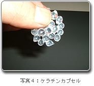 イオン性の異なる溶液の界面で複合体を形成するポリイオンコンプレックス法を用いて、ケラチン水溶液とキトサン水溶液とからケラチン-キトサンカプセルを試作しました(写真4)。このカプセル内にモデル薬物であるヘモグロビンを導入して徐放させることも可能で、ヘモグロビンの放出速度は、カプセル作製時のケラチン水溶液とキトサン水溶液の濃度に依存して変化しました。また、粒径を小さくすることでマイクロスケールのカプセルを作製することも可能でした。