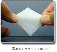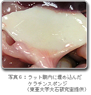 塩を鋳型として圧縮加熱成形法を用いて、ケラチンスポンジ(多孔体)及び生分解性樹脂との複合スポンジを試作しました(写真5)。ケラチンスポンジの気孔率は塩とケラチンとの比率によって、細孔径は塩の粒子径によって制御できます。 また、このケラチンスポンジは、マウス由来の繊維芽細胞の培養において細胞の3次元的培養が可能でした。ラットによる動物実験では、細胞の増殖用の足場材(スキャホールド)として再生医療材料への応用展開の可能性があることが分りました(写真6)。