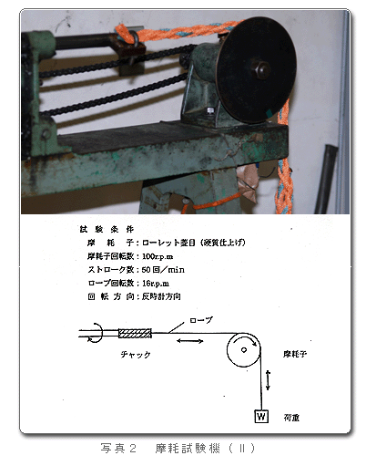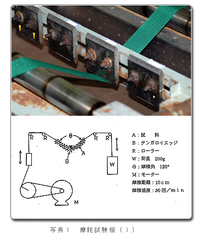 そこで、当センターでは、各方面の資料や業界関係者からの助言を参考にして、摩耗試験機(T)(写真1)、摩耗試験機(U)(写真2)を試作して、耐摩耗特性の評価を行い、業界のニーズに対応しています。