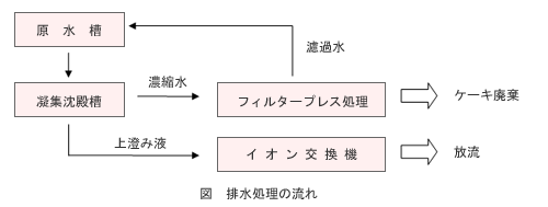 工場内の各種排水は原水槽に集められ、その後凝集沈殿処理により、上澄み液と沈殿に分離されます。沈殿は濃縮水として回収され、フィルタープレスにより汚泥ケーキにして廃棄処分されます。このとき発生した濾過水は原水槽に戻されます。