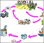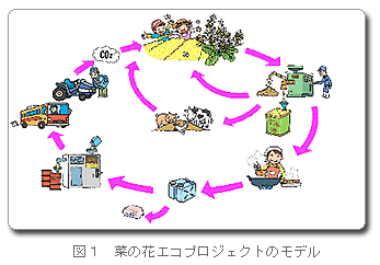 植物系バイオマスは広大な土地で発生する分散生産型であるため集荷や輸送に多大なコストを要し、これらを利用するにあたっては地域の特色を活かしたオンサイト型生産システムや地産地消型システムを構築する必要があります。この問題を解決するため国内各地で、地産地消型バイオマス利用を目指した「バイオマスタウン」が形成されています。愛知県においても、平成17年2月に策定した「食と緑の基本計画」の取り組みの一貫として、栽培した菜の花を農業や運送業などと連携して循環利用する、地産地消型の「菜の花エコプロジェクト」を行っています(図1)。