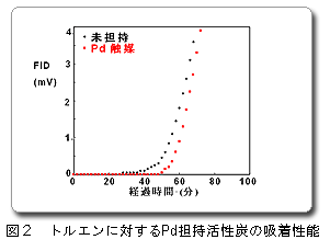 ●Pdを担持させた不織布状活性炭では、トルエンに対して寿命の増加が認められた。