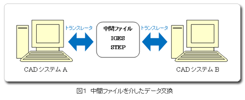 | CADシステムごとに設計データ(CADデータ)のファイル形式が異なるため、異なるCADシステム間でCADデータを交換する場合には、CADシステムのトランスレータを用いていったん中間ファイルに置き換える方法がとられることが一般的です(図1)。中間ファイルとして代表的なものとしては、IGES(Initial Graphics Exchange Specification:ANSI(アメリカ規格協会)の標準規格)があり、ほとんどの三次元CADシステムが対応しています。しかし、完全に互換性が保たれているわけではないので、複雑な形状や設計条件によっては、データの一部が破損するなどの不具合が生じることがあり、データ交換時のトラブルによる損失が重大な問題となっています。そこで新たに三次元CADの中間ファイルとしてSTEP(Standard for the Exchange of Product model data:ISO(国際標準化機構)の標準規格)が規格化されました。IGESより正確なデータ交換が期待できるため、今後はIGESからSTEPに移行していくものと思われます。