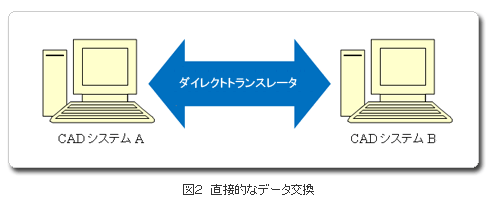 | また、異なるCADシステム間で中間ファイルを介さずに直接データを変換するダイレクトトランスレータを用いたデータ交換の方法もあります(図2)。ただし、ソフトウェア内部での処理は中間ファイルに変換した場合と同じことが多いため、この方法でも完全な互換性が保たれるわけではありません。