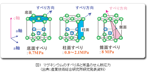塑性加工プロセスは一般的に材料歩留まりが高く、高品質の製品を製造できるので、マグネシウムの塑性加工による高機能化が望まれる所以です。しかし、マグネシウムの延性はアルミニウムや鉄に比較して低くなっています。アルミニウムや鉄はそれぞれ面心立方構造及び体心立方構造という対称性の高い等方的な構造により、原子面が容易に滑ることによって変形します。これに対してマグネシウムは、最密六方構造という異方性の結晶構造を持ち、滑りやすい原子面の数が少なくなっています。最密六方構造では図1に示すように、小さな応力で滑る結晶面と常温ではほとんど滑らない結晶面があり、常温で変形させると内部に大きな応力集中が生じて割れてしまいます。しかし、常温で滑りにくい結晶面も高温では滑りに要する応力が低下し、比較的容易に変形できるようになります。