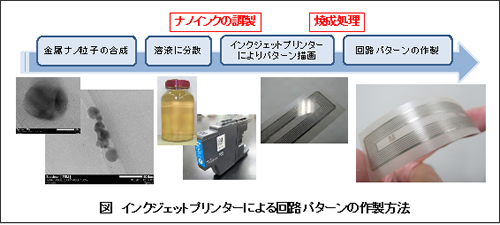 配線基板などに利用される回路パターンをインクジェットプリンターを用いて作製するための一般的な工程は図のように表すことができます。まず、銀などの金属のナノレベル(百万分の1ミリメートル)の微粒子を合成し、この微粒子を溶液に分散させることでナノインクと呼ばれるものを調製します。均一なインクを調製するためには、金属ナノ粒子の表面を有機系の表面処理物質で覆うことで溶液中での分散性を高めることが必要不可欠になります。調製したナノインクは、通常のインクと同様に直接プリンターに導入して、パソコンで作製した回路パターンなどの印刷に使用します。印刷する基材はPETフィルムなどのフレキシブルな基材を用いることが多く、必要に応じて基材表面にインクとの親和性を高めるための処理を施すこともあります。調製したナノインクを用いてインクジェットプリンターで印刷された回路パターンは、そのままの状態では導電性はありません。導電性を発現させるためには、金属ナノ粒子の表面を覆っていた表面処理物質を除去するための焼成処理が必要です。一般的には、百数十度以上の熱処理を数十分間行うことで表面処理物質が除去され、金属ナノ粒子同士が接触して導電性が得られます。この一連の工程を経て回路パターンが完成します。
