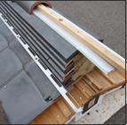 ・積み上げたのし瓦の側面には、L形補強金具を使用し、棟付近の桟瓦(さんがわら)は固定用補強ビスで1枚づつ瓦を貫通させ、瓦下の合板(野地板・のじいた)に固定します。