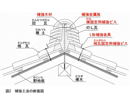 瓦屋根の工法は、平成7年1月の兵庫県南部地震(阪神・淡路大震災)を受け、ガイドライン工法がまとめられました。震災の際、住宅の瓦はすべてが一様に破損したわけではなく、屋根の頂点部分(棟・むね)に被害が集中しました(図1)。ガイドライン工法は、この棟を従来の土のみで固定する工法ではなく、棟部を金属の金具等でしっかりと固定する工法です。平成23年3月の東日本大震災において、このガイドライン工法を採用した住宅では、棟部の倒壊・破損はほとんど見られませんでした。