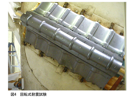ガイドライン工法の標準試験として、回転式耐震試験があります(図4)。この試験は実際の部材を用いて作られた小さな棟を縦90°に立て、規定の速度で回転させることで棟に力をかけます。この回転式耐震試験において、1Gの力をかけても異常がありませんでした。これはおよそ震度6の地震に耐えられることに相当します。
